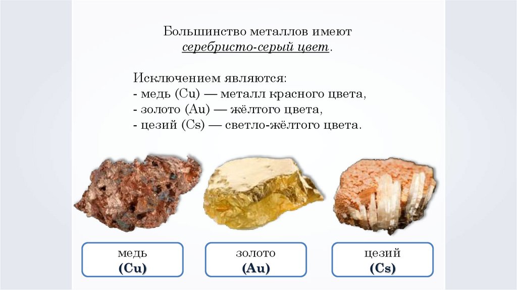 Большинство металлов имеютсеребристо-серый цвет.