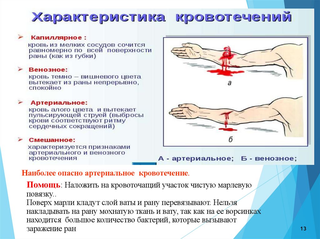 Наиболее опасно артериальное кровотечение.Помощь: Наложить на кровоточащий участок чистую марлевую
