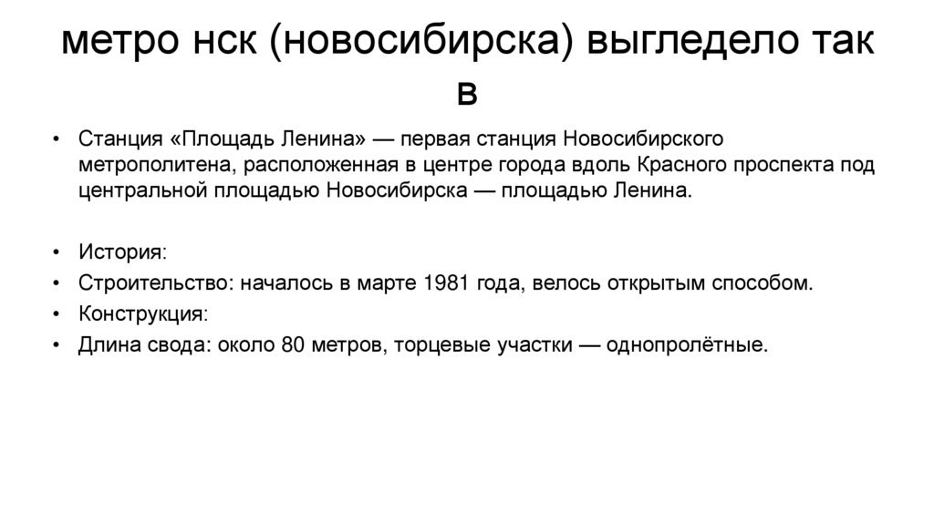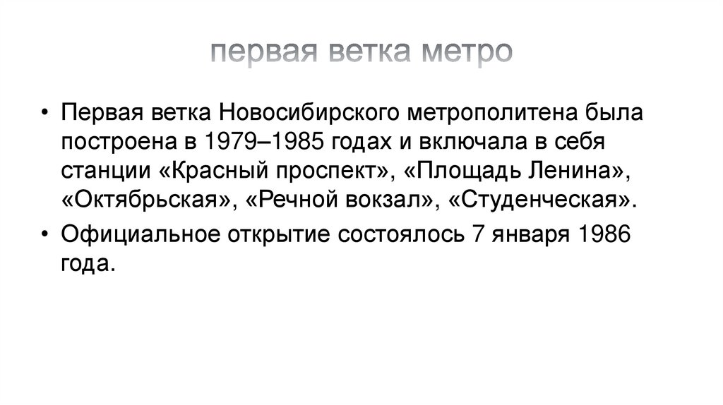 • Первая ветка Новосибирского метрополитена былапостроена в 1979–1985 годах и включала в себя