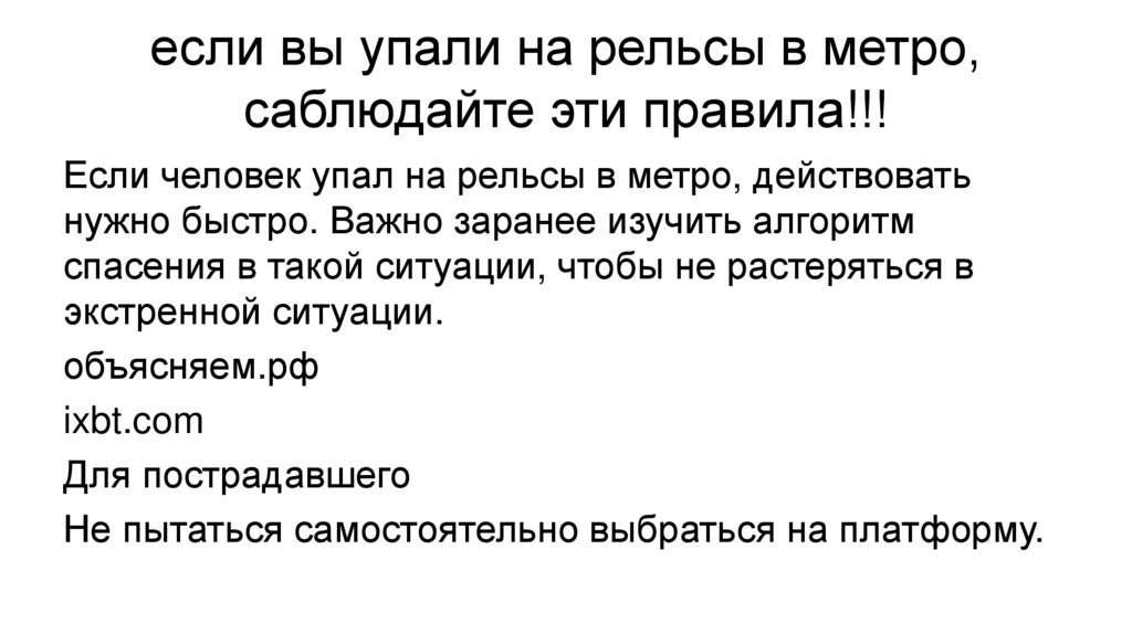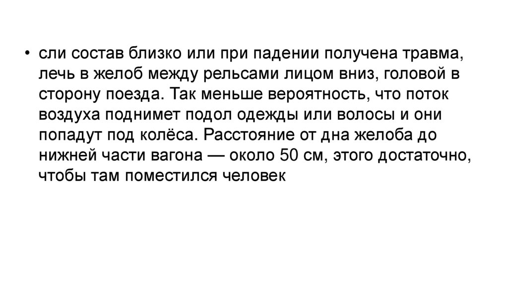• сли состав близко или при падении получена травма,лечь в желоб между рельсами лицом вниз, головой в