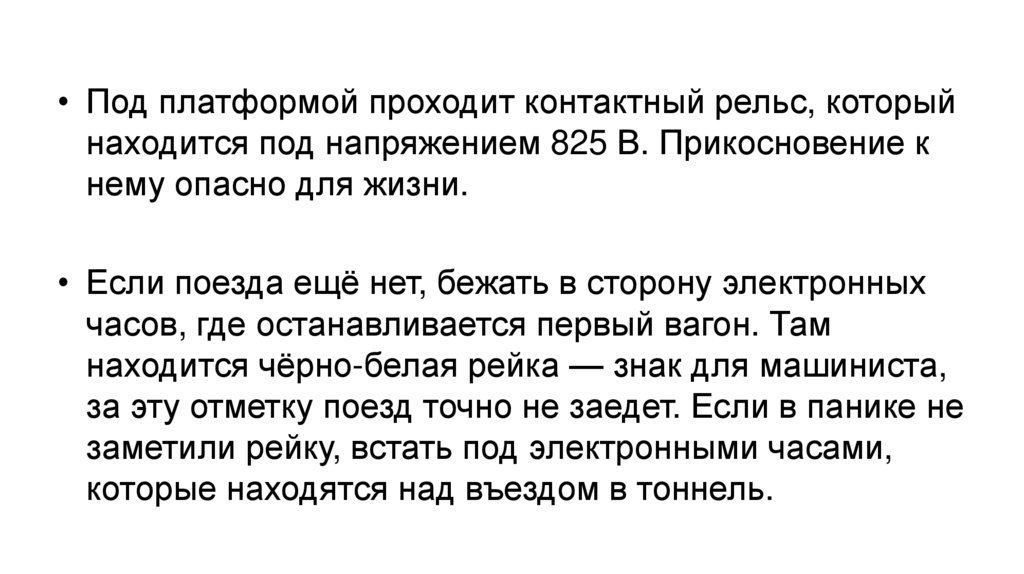 • Под платформой проходит контактный рельс, которыйнаходится под напряжением 825 В. Прикосновение к