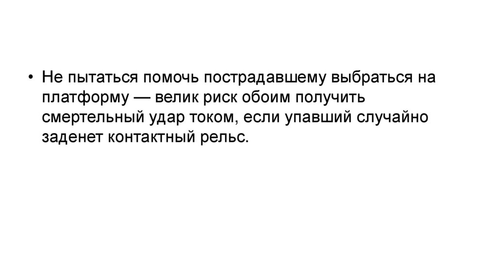 • Не пытаться помочь пострадавшему выбраться наплатформу — велик риск обоим получить