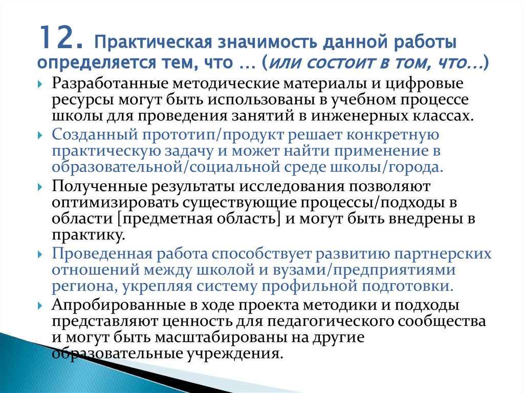 12. Практическая значимость данной работыопределяется тем, что … (или состоит в том, что…)