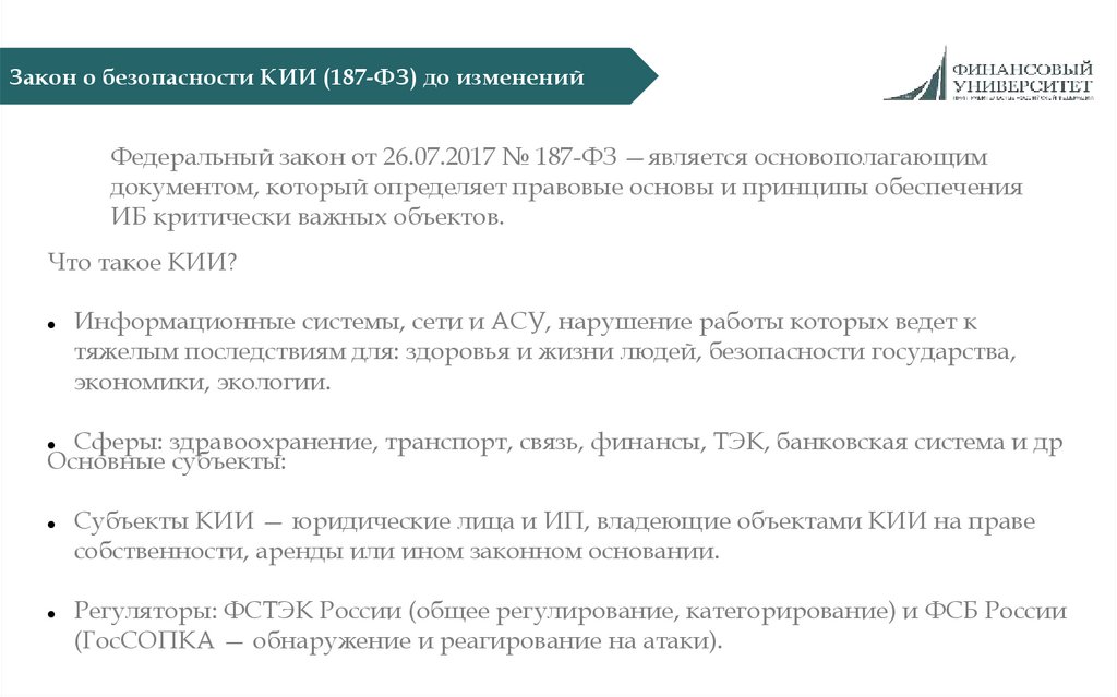 Закон о безопасности КИИ (187-ФЗ) до измененийФедеральный закон от 26.07.2017 № 187-ФЗ —является основополагающим