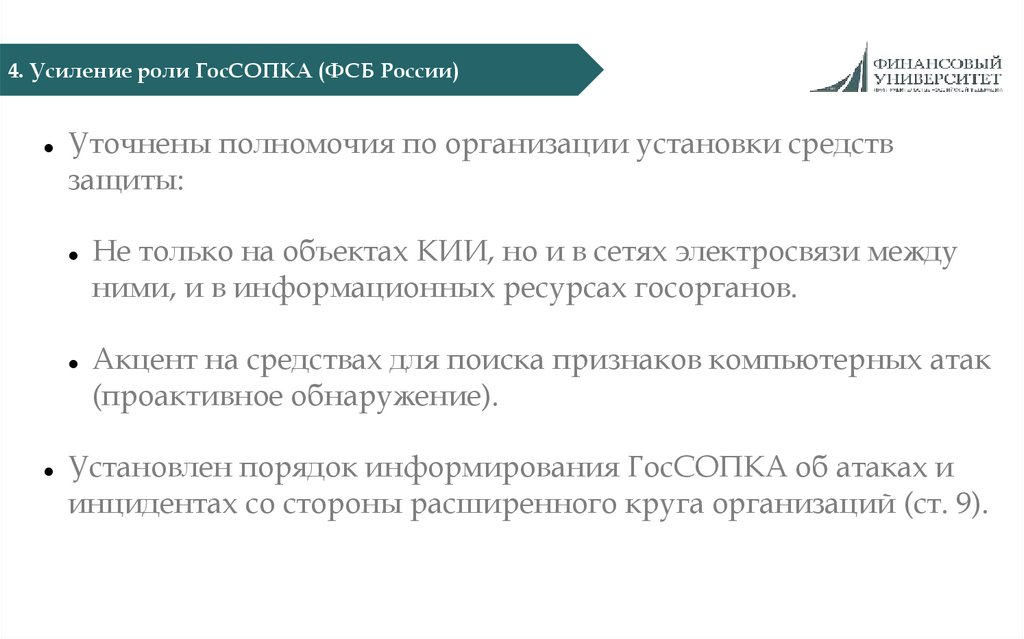 4. Усиление роли ГосСОПКА (ФСБ России)Уточнены полномочия по организации установки средств