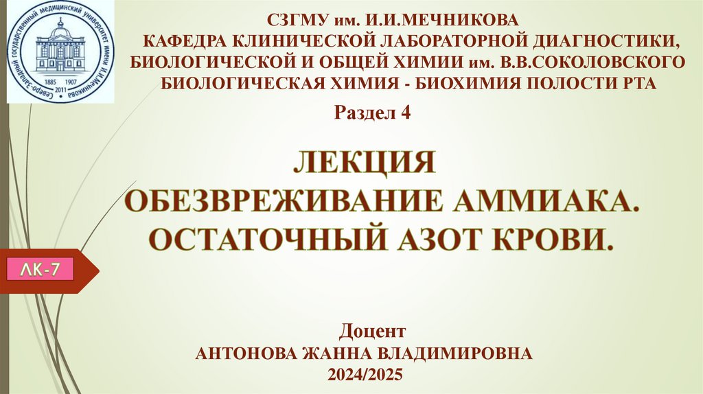 1. СЗГМУ им. И.И.МЕЧНИКОВА КАФЕДРА КЛИНИЧЕСКОЙ ЛАБОРАТОРНОЙ ДИАГНОСТИКИ, БИОЛОГИЧЕСКОЙ И ОБЩЕЙ ХИМИИ им. В.В.СОКОЛОВСКОГО