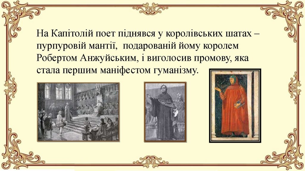 На Капітолій поет піднявся у королівських шатах –пурпуровій мантії, подарованій йому королем