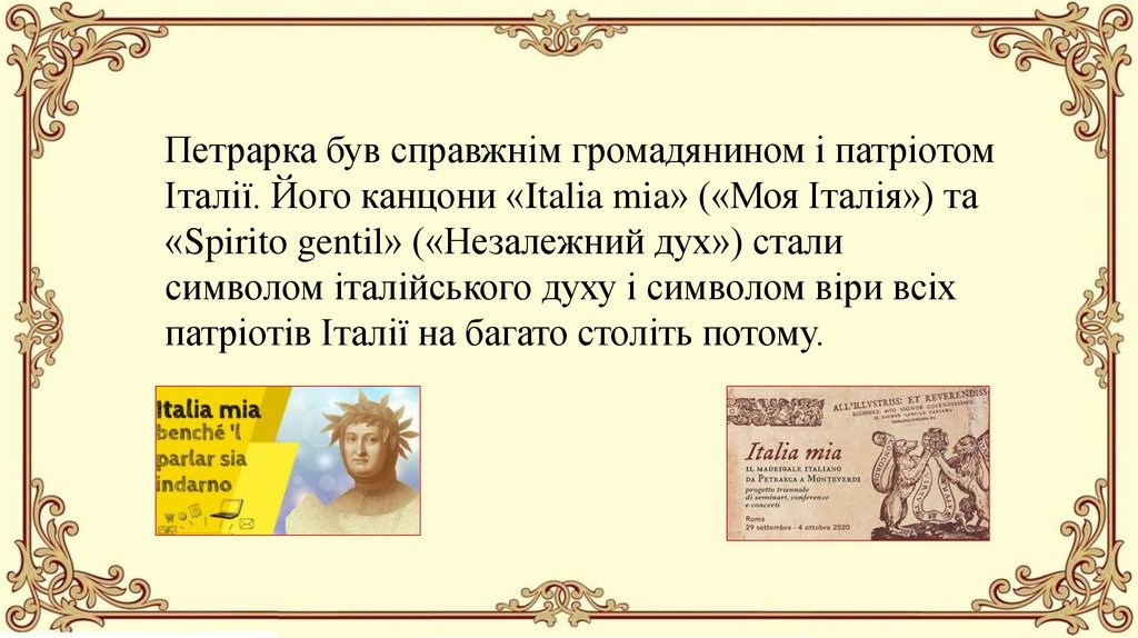 Петрарка був справжнім громадянином і патріотомІталії. Його канцони «Italia mia» («Моя Італія») та