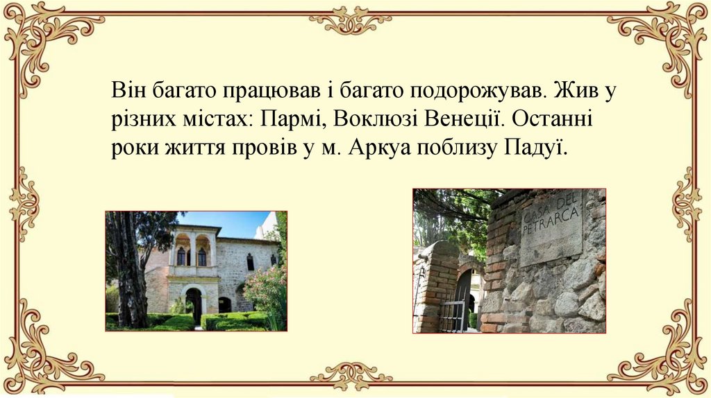 Він багато працював і багато подорожував. Жив урізних містах: Пармі, Воклюзі Венеції. Останні