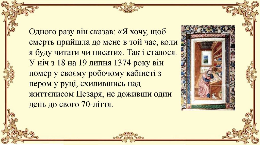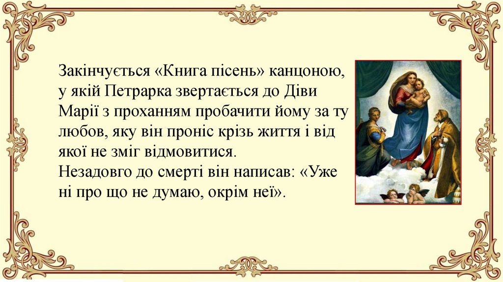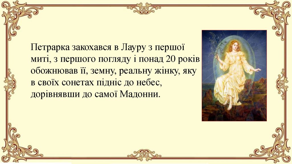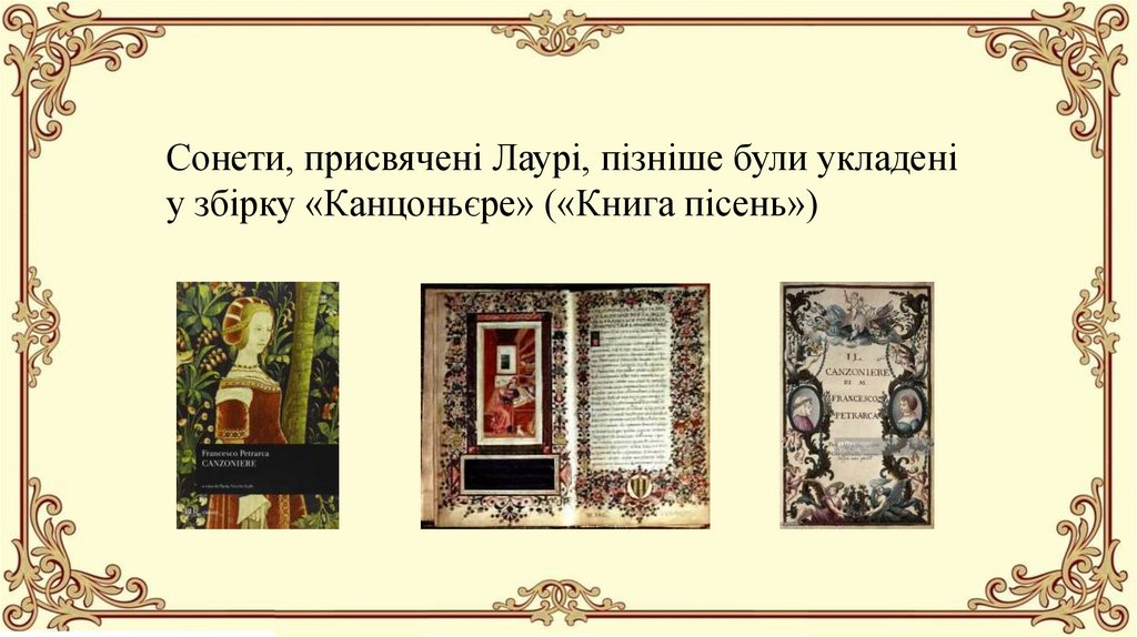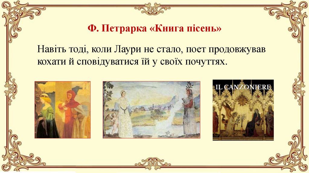 Ф. Петрарка «Книга пісень»Навіть тоді, коли Лаури не стало, поет продовжував