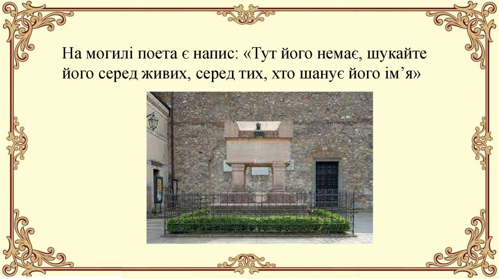 На могилі поета є напис: «Тут його немає, шукайтейого серед живих, серед тих, хто шанує його ім’я»