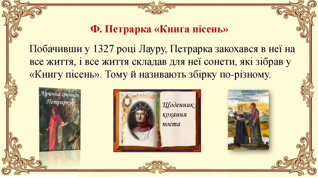 Ф. Петрарка «Книга пісень»Побачивши у 1327 році Лауру, Петрарка закохався в неї на