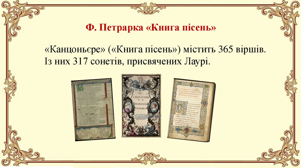 Ф. Петрарка «Книга пісень»«Канцоньєре» («Книга пісень») містить 365 віршів.