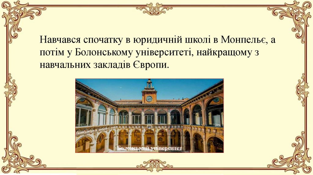 Навчався спочатку в юридичній школі в Монпельє, апотім у Болонському університеті, найкращому з
