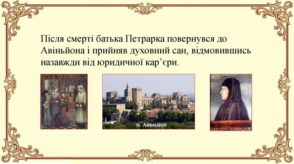 Після смерті батька Петрарка повернувся доАвіньйона і прийняв духовний сан, відмовившись