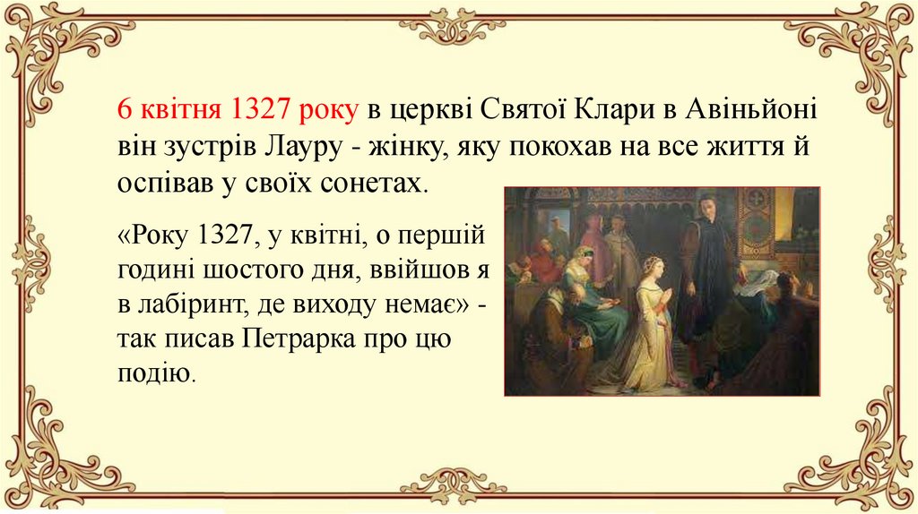6 квітня 1327 року в церкві Святої Клари в Авіньйонівін зустрів Лауру - жінку, яку покохав на все життя й