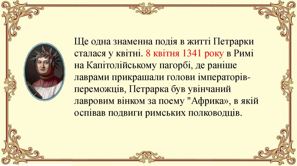 Ще одна знаменна подія в житті Петраркисталася у квітні. 8 квітня 1341 року в Римі