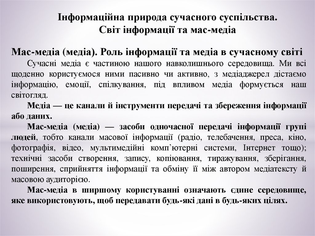 Інформаційна природа сучасного суспільства.Світ інформації та мас-медіа