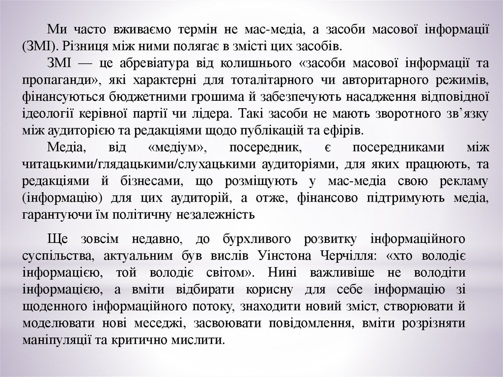 Ми часто вживаємо термін не мас-медіа, а засоби масової інформації(ЗМІ). Різниця між ними полягає в змісті цих засобів.