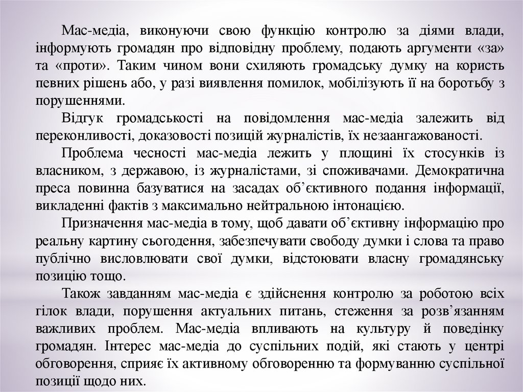 Також завданням мас-медіа є здійснення контролю за роботою всіх