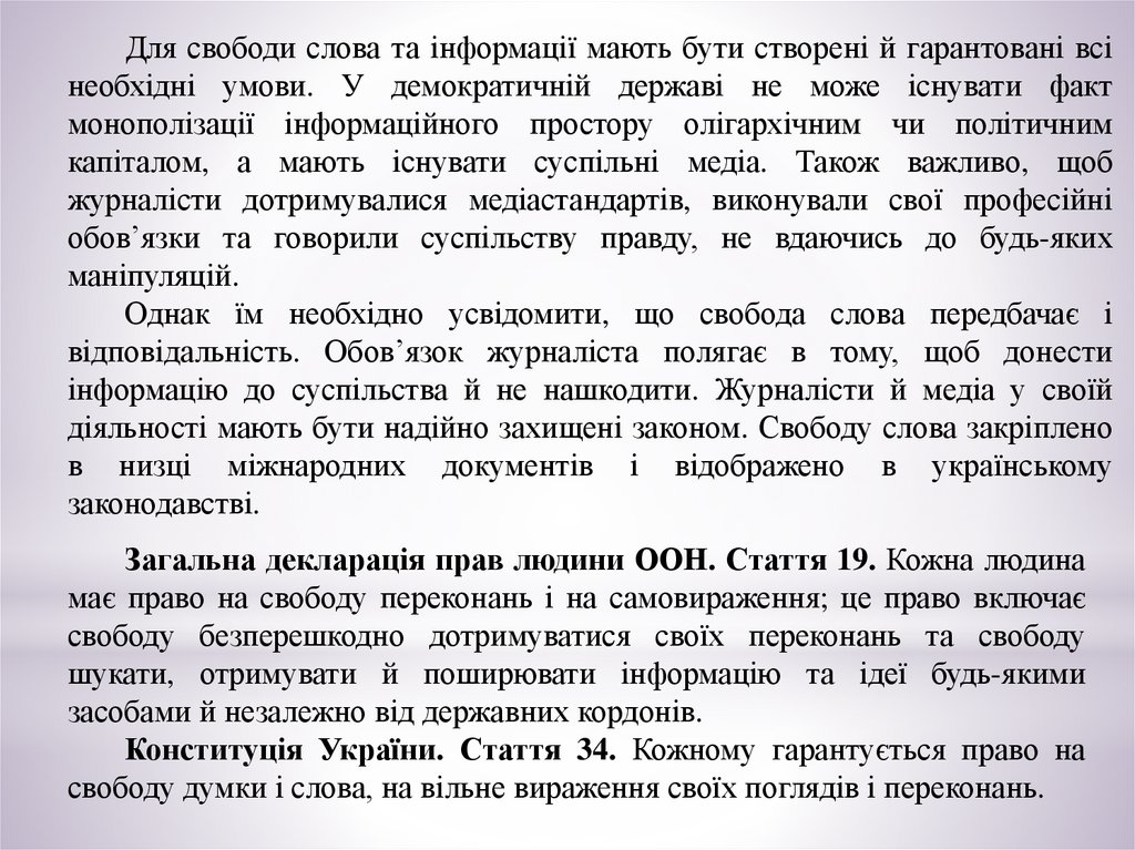 Для свободи слова та інформації мають бути створені й гарантовані всінеобхідні умови. У демократичній державі не може існувати факт