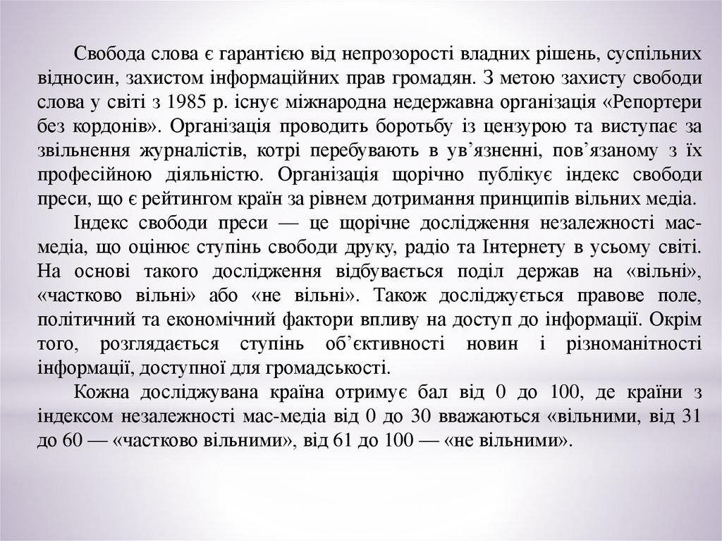 Свобода слова є гарантією від непрозорості владних рішень, суспільнихвідносин, захистом інформаційних прав громадян. З метою захисту свободи