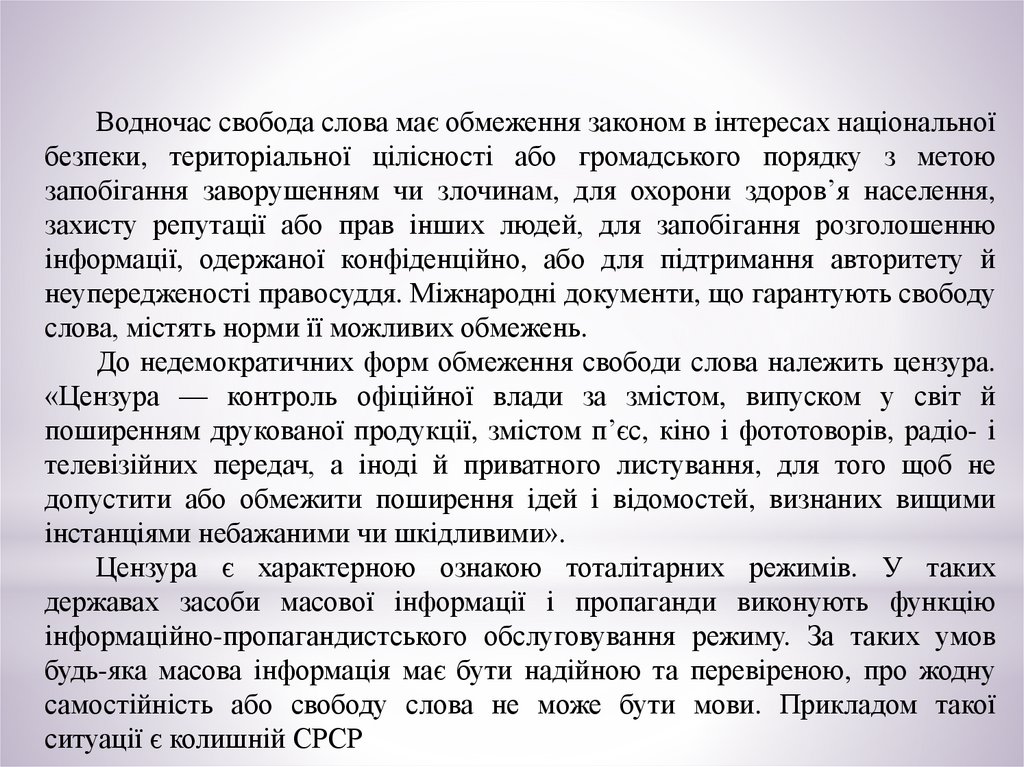 діяльності мають бути надійно захищені законом. Свободу слова закріплено