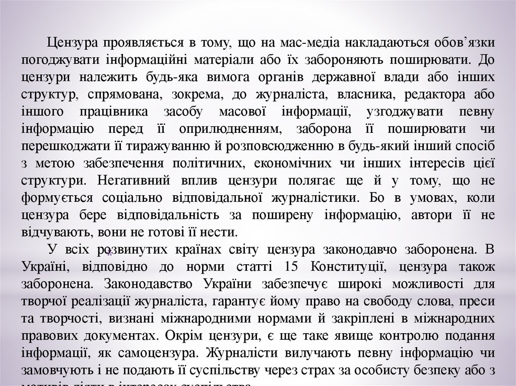 Цензура проявляється в тому, що на мас-медіа накладаються обов’язкипогоджувати інформаційні матеріали або їх забороняють поширювати. До