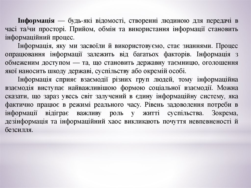 Інформація — будь-які відомості, створенні людиною для передачі вчасі та/чи просторі. Прийом, обмін та використання інформації становить
