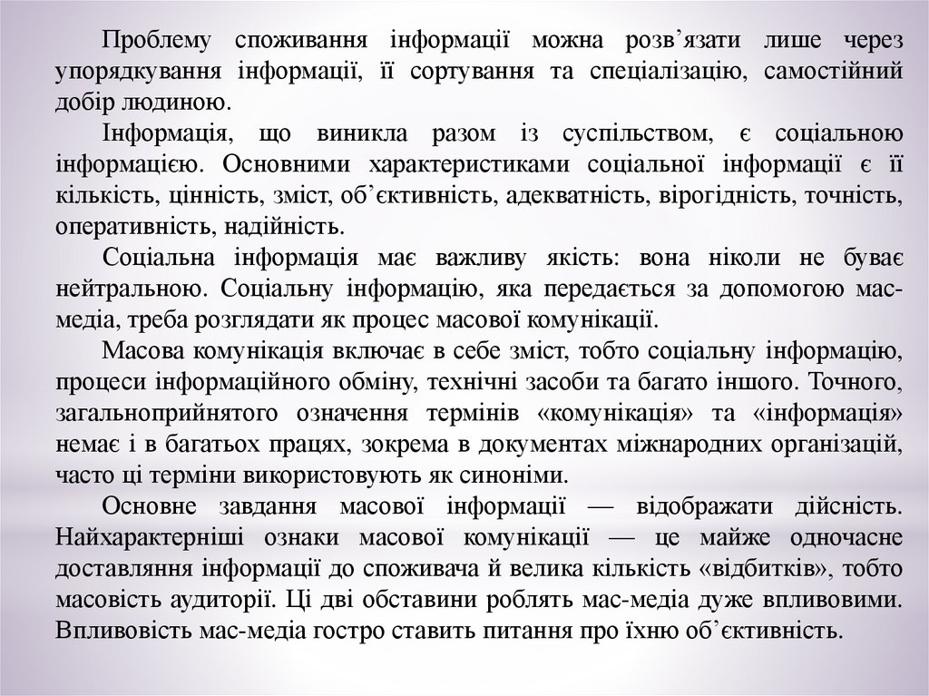 нейтральною. Соціальну інформацію, яка передається за допомогою масмедіа, треба розглядати як процес масової комунікації.