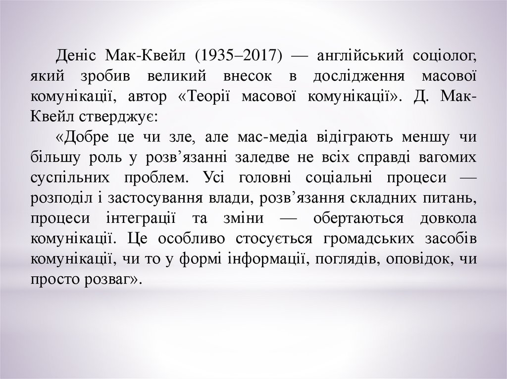 комунікації, автор «Теорії масової комунікації». Д. МакКвейл стверджує: