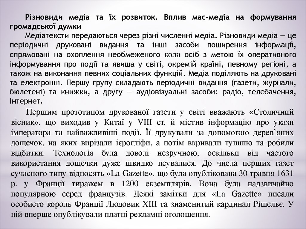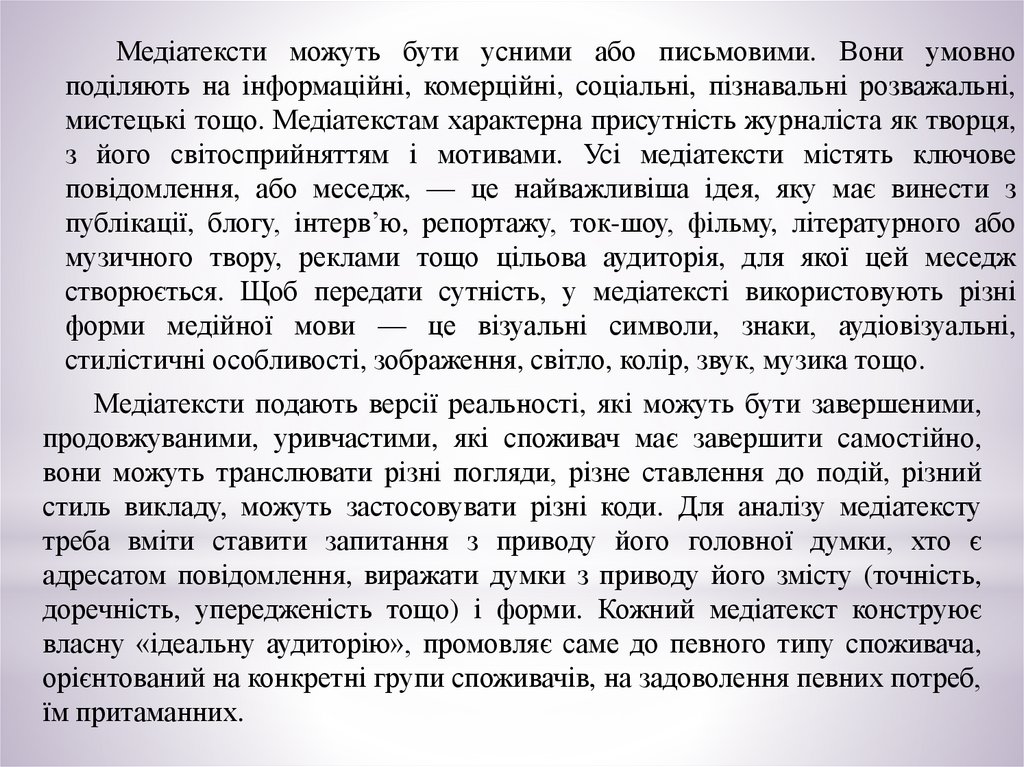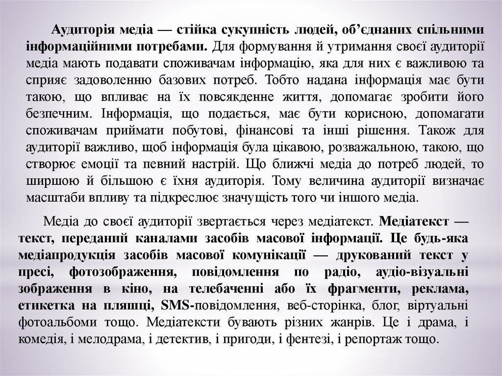 Медіа до своєї аудиторії звертається через медіатекст. Медіатекст —