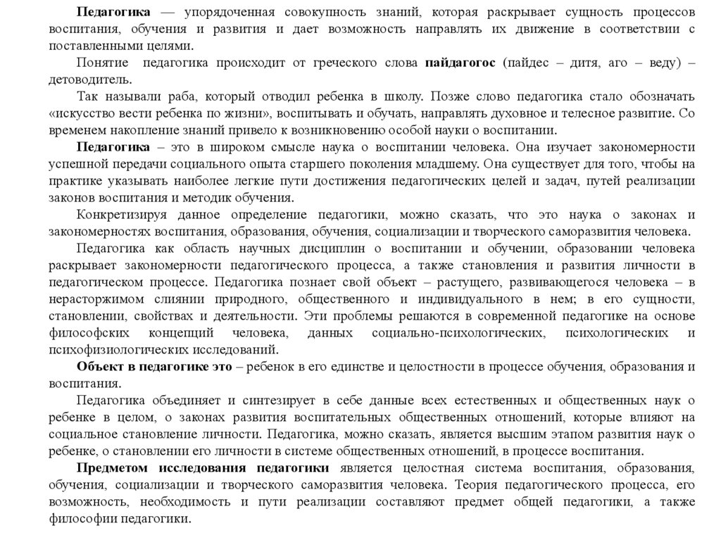 Педагогика — упорядоченная совокупность знаний, которая раскрывает сущность процессоввоспитания, обучения и развития и дает возможность направлять их движение в соответствии с