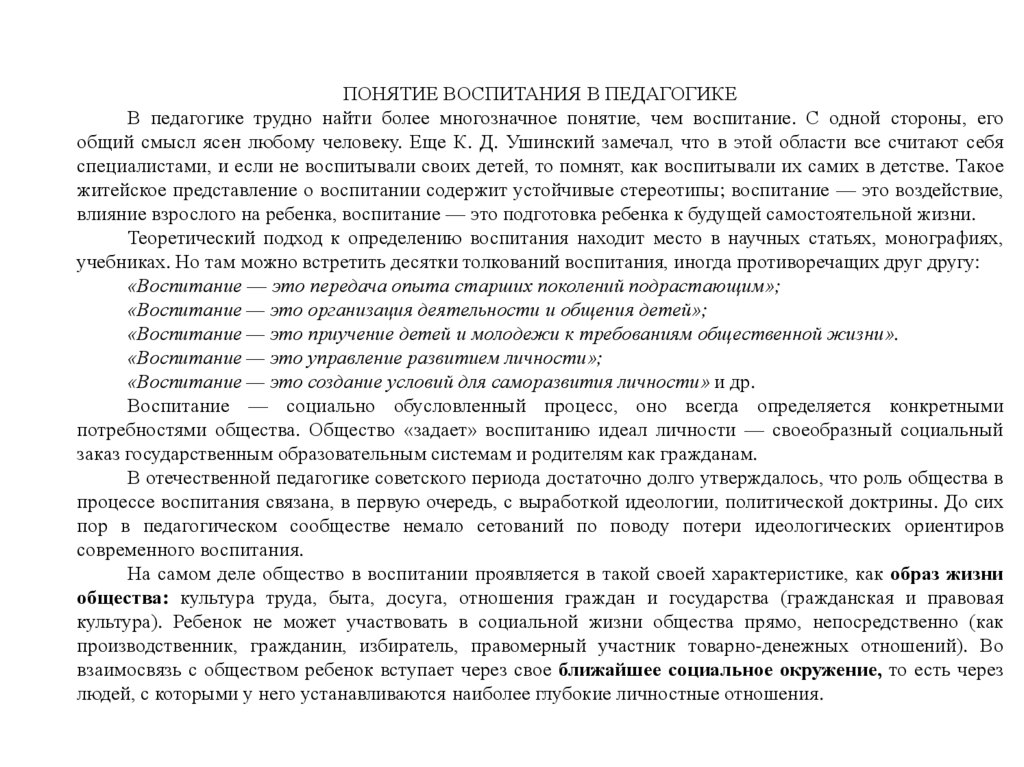 отождествляя воспитание с социализацией), и воспитание в узком смысле — как целенаправленную