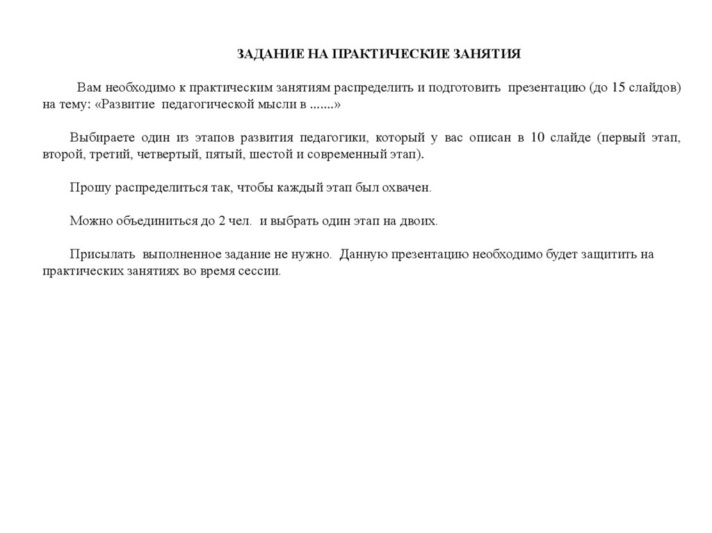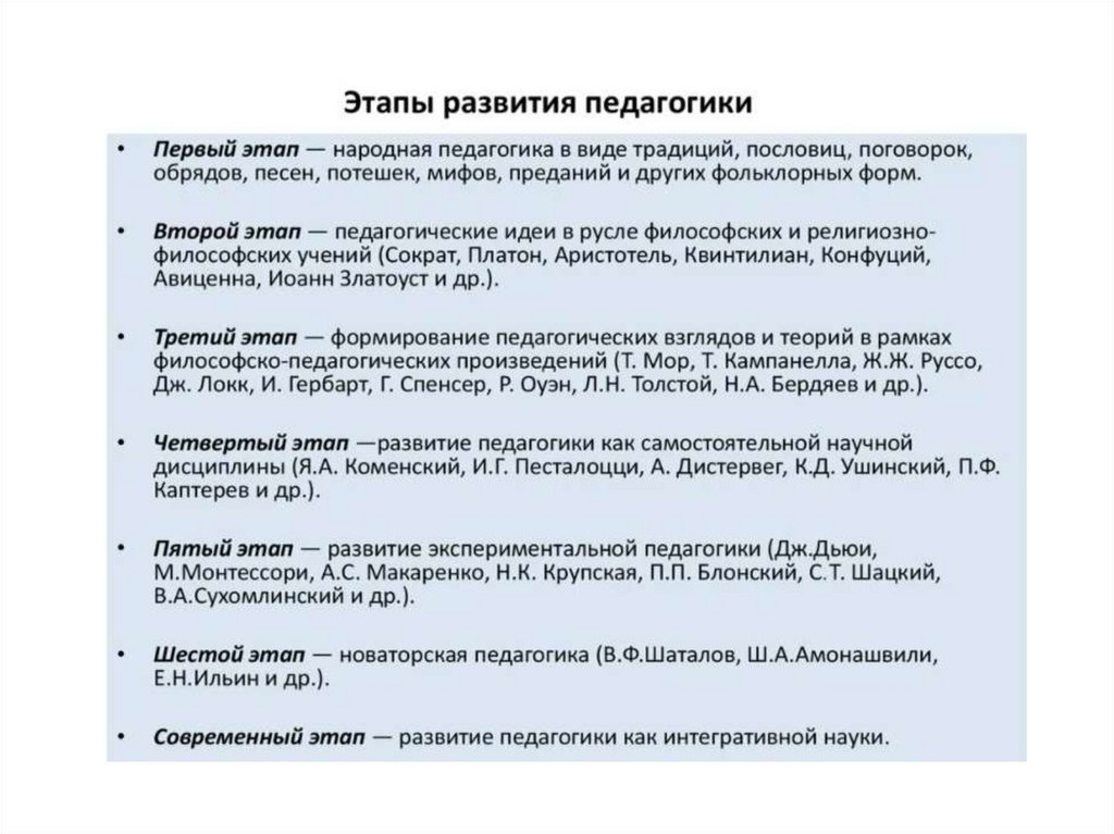 Выбираете один из этапов развития педагогики, который у вас описан в 10 слайде (первый этап,