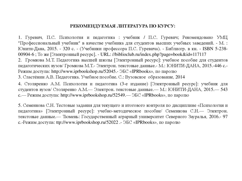 РЕКОМЕНДУЕМАЯ ЛИТЕРАТУРА ПО КУРСУ:1. Гуревич, П.С. Психология и педагогика : учебник / П.С. Гуревич; Рекомендовано УМЦ