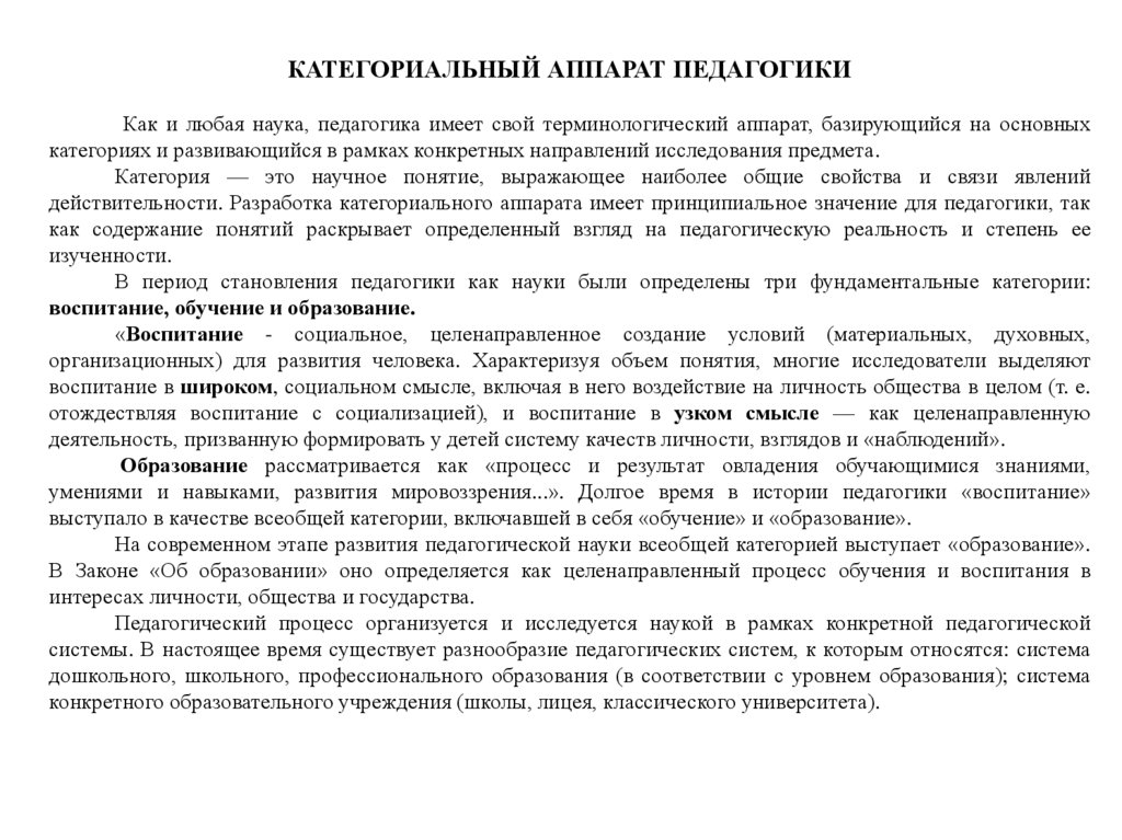 действительности. Разработка категориального аппарата имеет принципиальное значение для педагогики, так