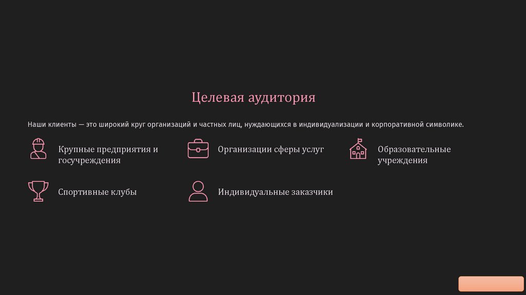 Целевая аудиторияНаши клиенты — это широкий круг организаций и частных лиц, нуждающихся в индивидуализации и корпоративной символике.