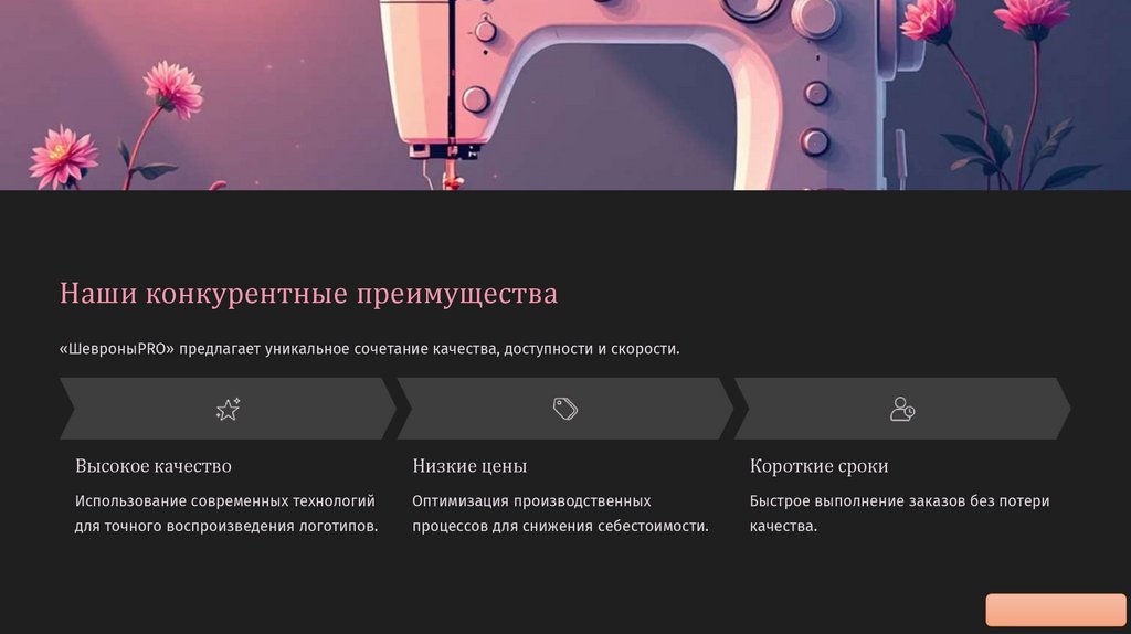 Наши конкурентные преимущества«ШевроныPRO» предлагает уникальное сочетание качества, доступности и скорости.