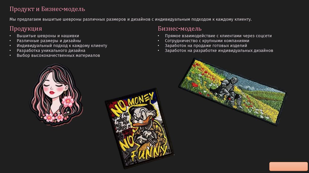 Продукт и Бизнес-модельМы предлагаем вышитые шевроны различных размеров и дизайнов с индивидуальным подходом к каждому клиенту.