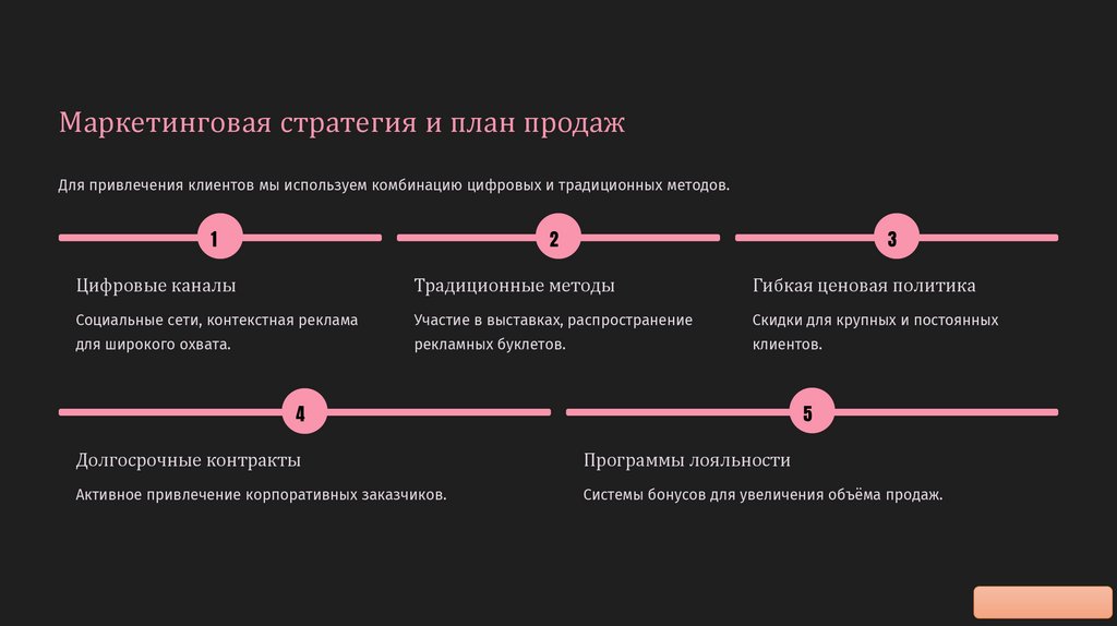 Маркетинговая стратегия и план продажДля привлечения клиентов мы используем комбинацию цифровых и традиционных методов.