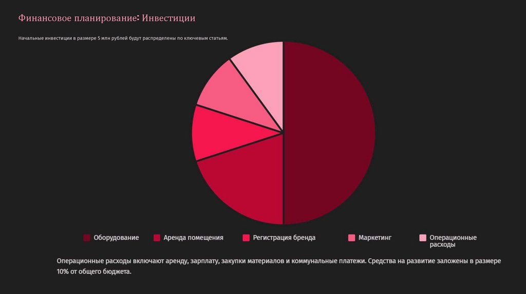 Финансовое планирование: ИнвестицииНачальные инвестиции в размере 5 млн рублей будут распределены по ключевым статьям.