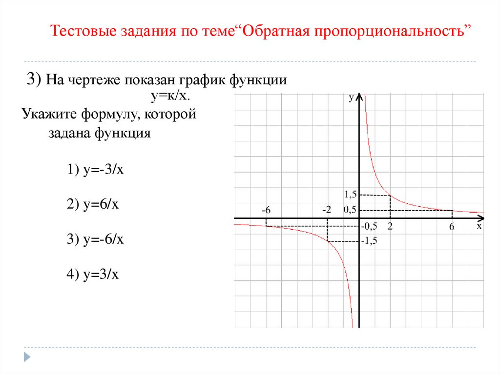 Тестовые задания по теме“Обратная пропорциональность”3) На чертеже показан график функции