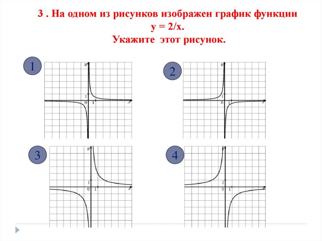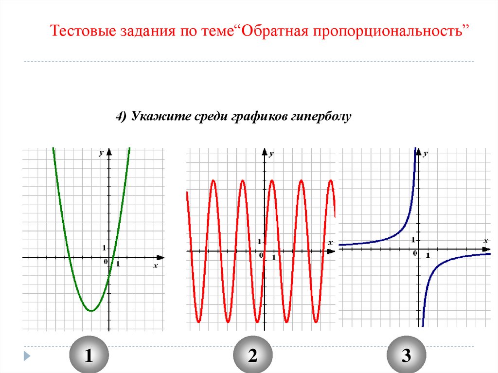 Тестовые задания по теме“Обратная пропорциональность”4) Укажите среди графиков гиперболу