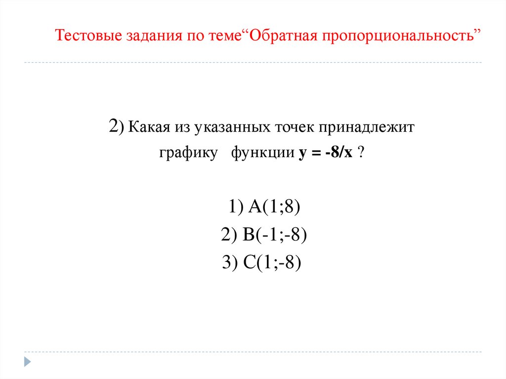 Тестовые задания по теме“Обратная пропорциональность”2) Какая из указанных точек принадлежит