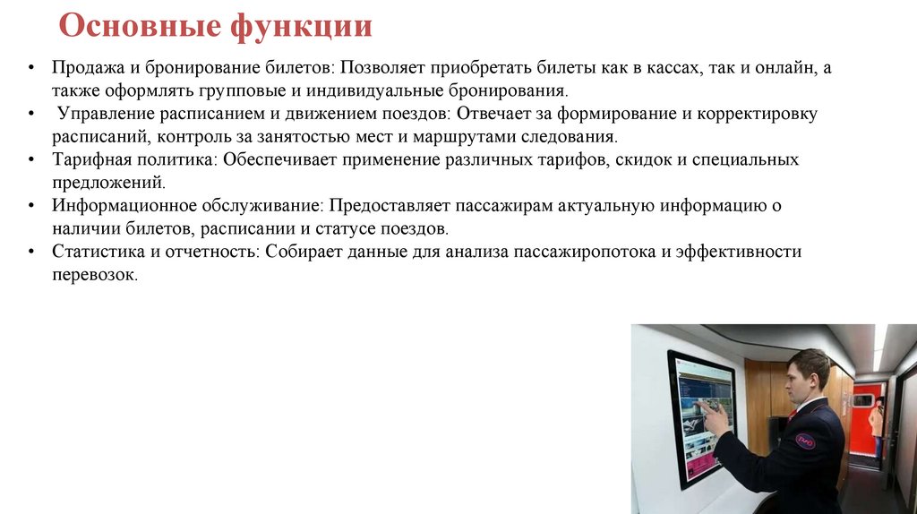 Основные функции• Продажа и бронирование билетов: Позволяет приобретать билеты как в кассах, так и онлайн, а