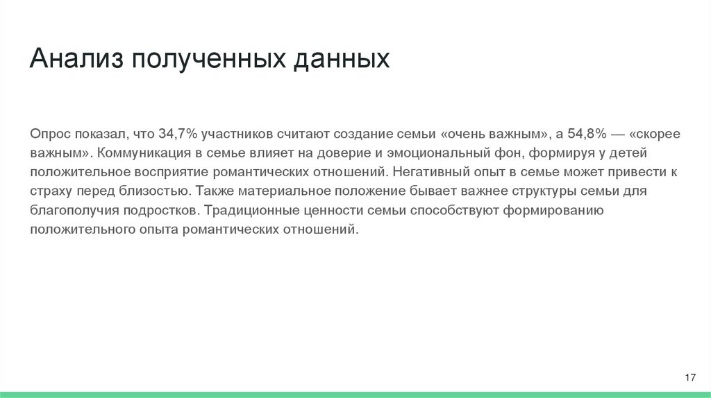 Анализ полученных данныхОпрос показал, что 34,7% участников считают создание семьи «очень важным», а 54,8% — «скорее
