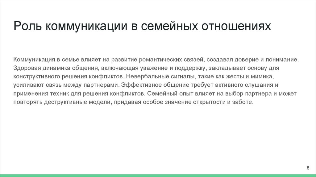 Роль коммуникации в семейных отношенияхКоммуникация в семье влияет на развитие романтических связей, создавая доверие и понимание.