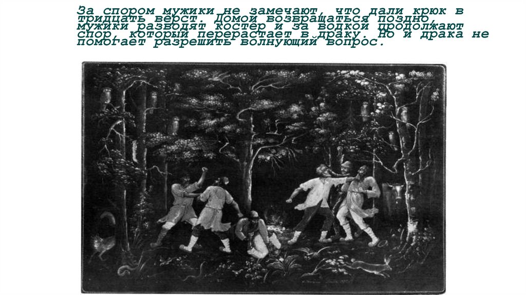 За спором мужики не замечают, что дали крюк втридцать вёрст. Домой возвращаться поздно,