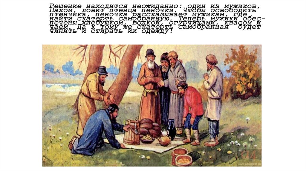 найти скатерть самобранную. Теперь мужики обеспечены хлебушком, водкой, огурчиками, квасом и